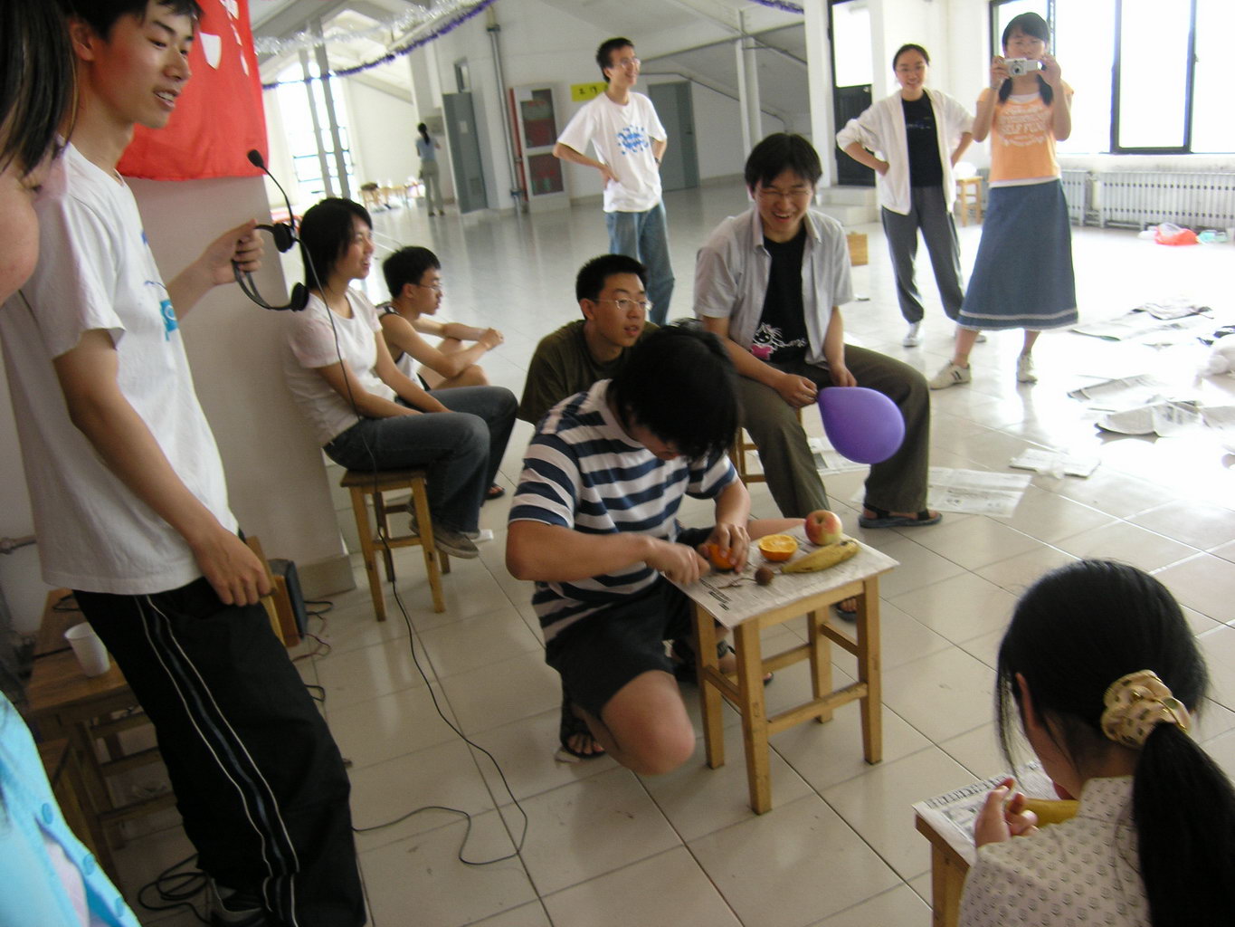 跑道远端放四张凳子,有各种水果。参赛者跑到尽头取回一种水果,吃完。