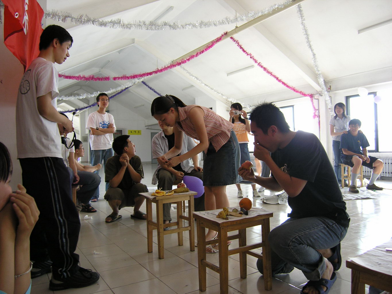 : 跑道远端放四张凳子,有各种水果。参赛者跑到尽头取回一种水果,吃完。