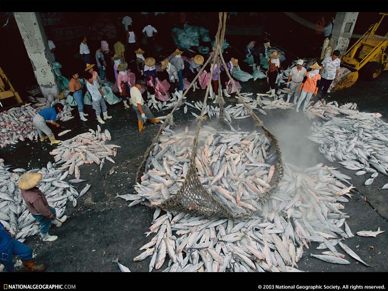"In Taiwan's main harbor a refrigerator ship unloads tons of fish caught off