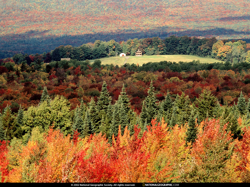 A farm forms an island in a sea of spruces, maples, beechwoods, and oaks.