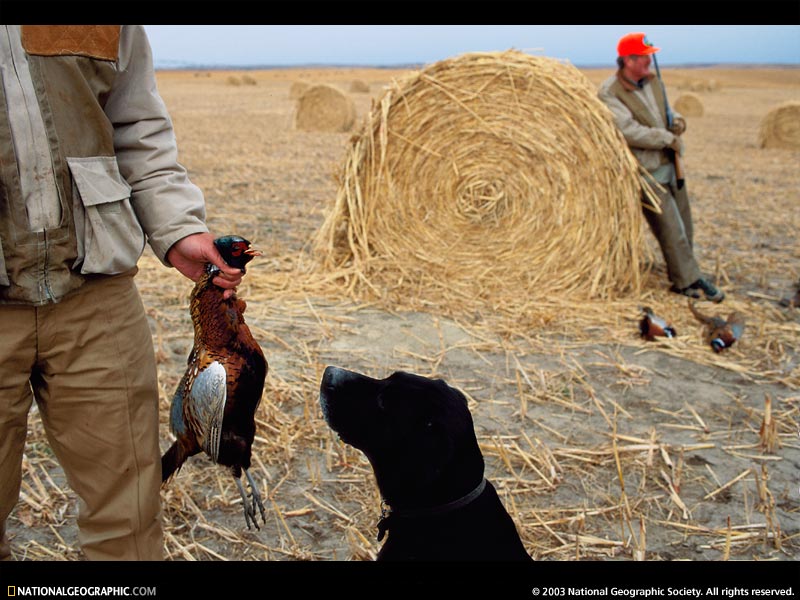 "A hunter grasps a prized ring-necked pheasant, bagged during a popular annua