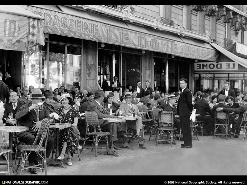 "Cafe-goers enjoy a pleasant afternoon in Montparnasse—Left Bank center of b