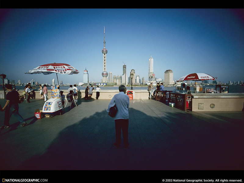 "The Oriental Pearl TV Tower, 1,500 feet [457 meters] tall, soars over the mo