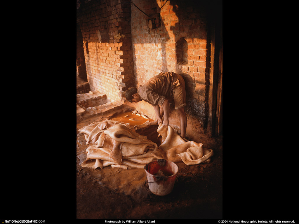 (pictured) a member of the Chamar leatherworking caste softens water buffalo