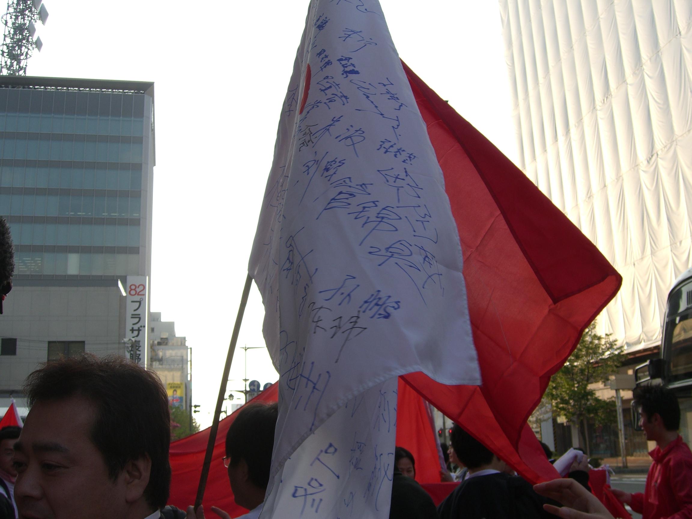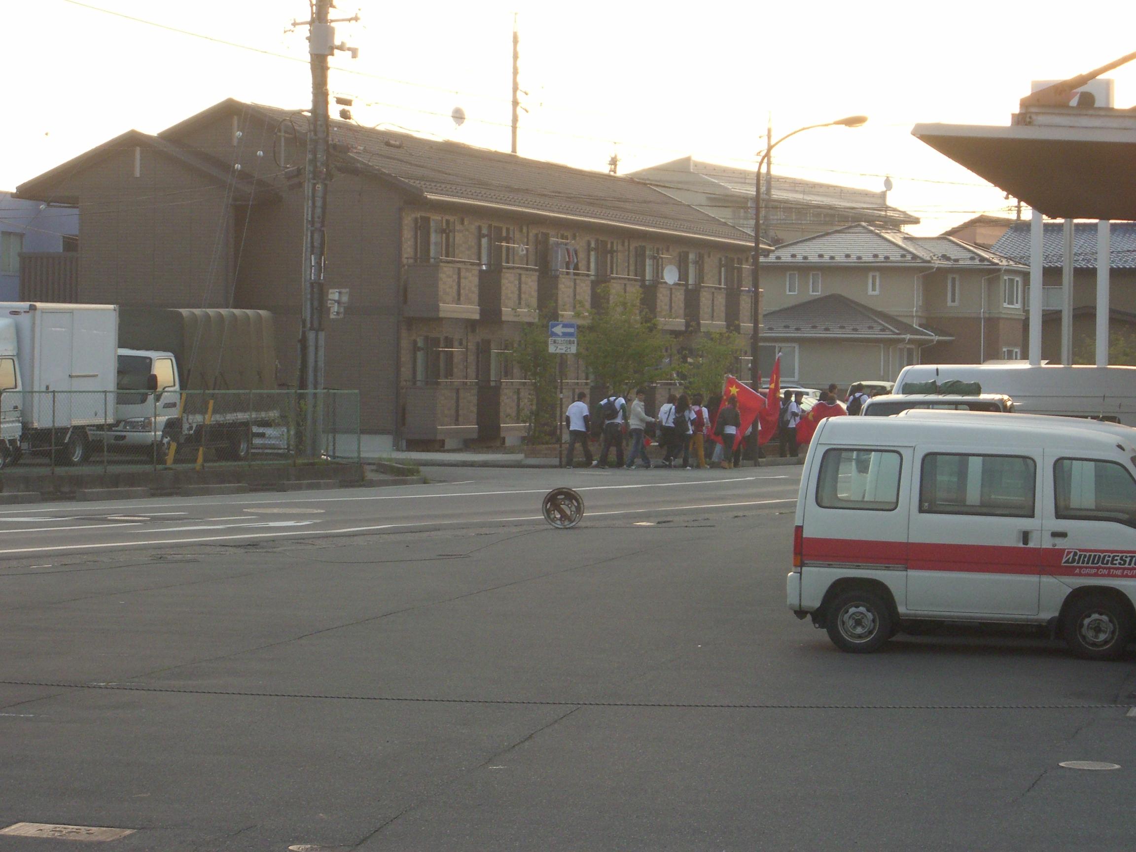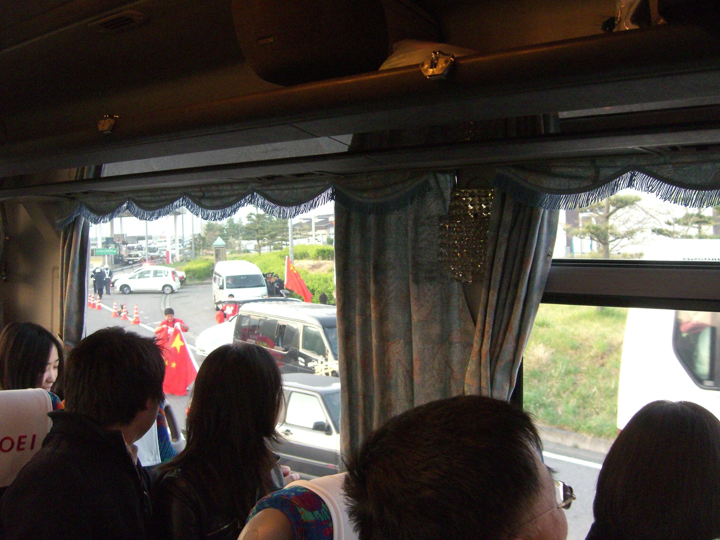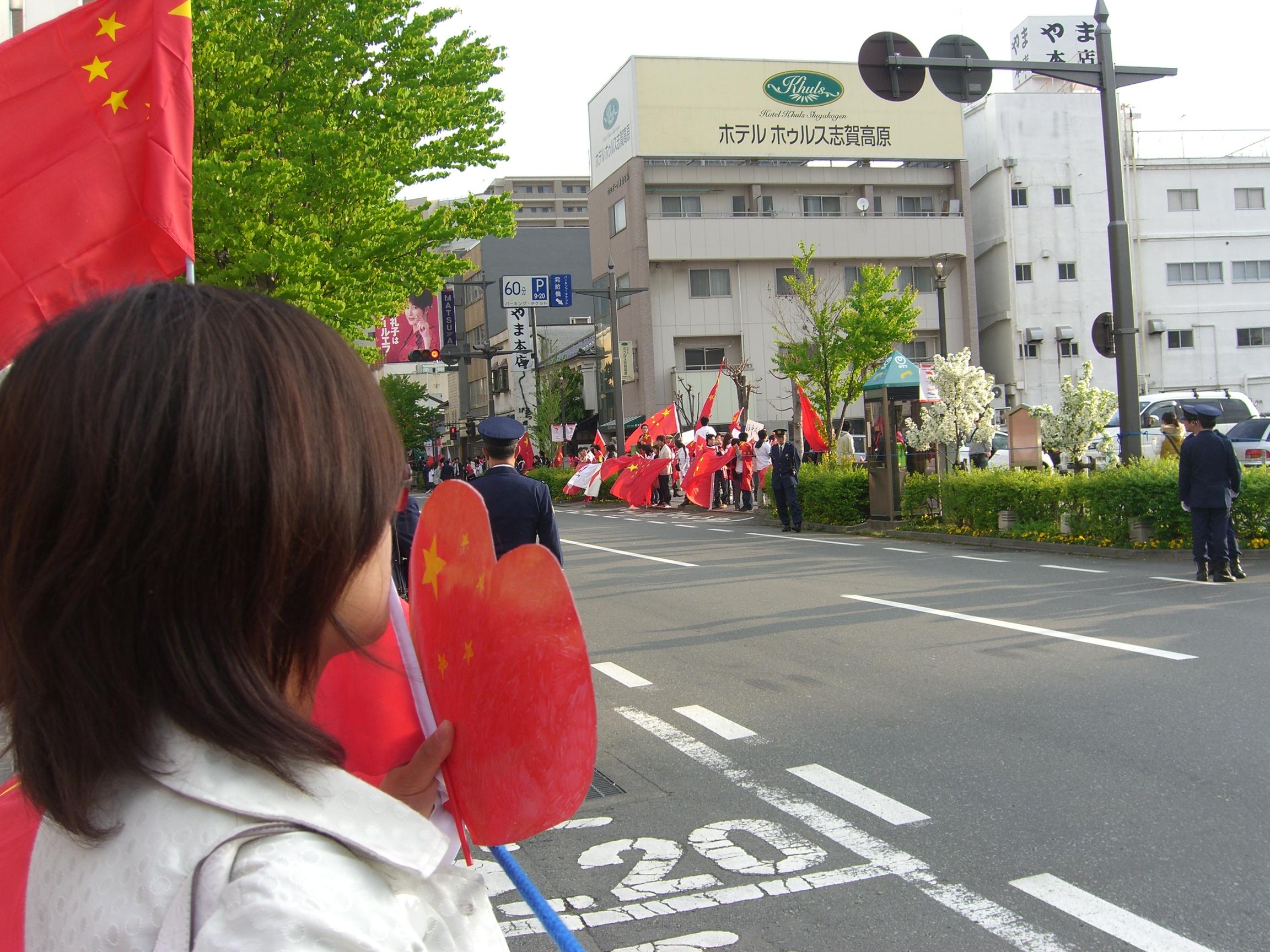 车上大家都有点兴奋,邻座mm刚打完工赶过来,其中一人的父亲还特地寄了国旗和奥运旗过来,很赞。12点才发车,很郁闷负责人还要拿着话筒再讲一堆虚话,影响睡觉。倒是还有TBS的过来摄像采访,在活动开始时也还一直在我们旁边,本想坐我们车来着,不过据说是右翼电视台,而且也没座,让他下去了,laf,有个摄像机估计睡觉都不安稳。好久没坐大巴了,似乎还有点晕,椅背也睡不舒服。大概六点到达目的地,长野街上人比较少,不过沿路看到一拨一拨的举着红旗的人就很亲切,车内车外互相致意,也有看到ZD们的大巴,没咱学生有精神啊,车内满目红旗对方才一面旗子应战。